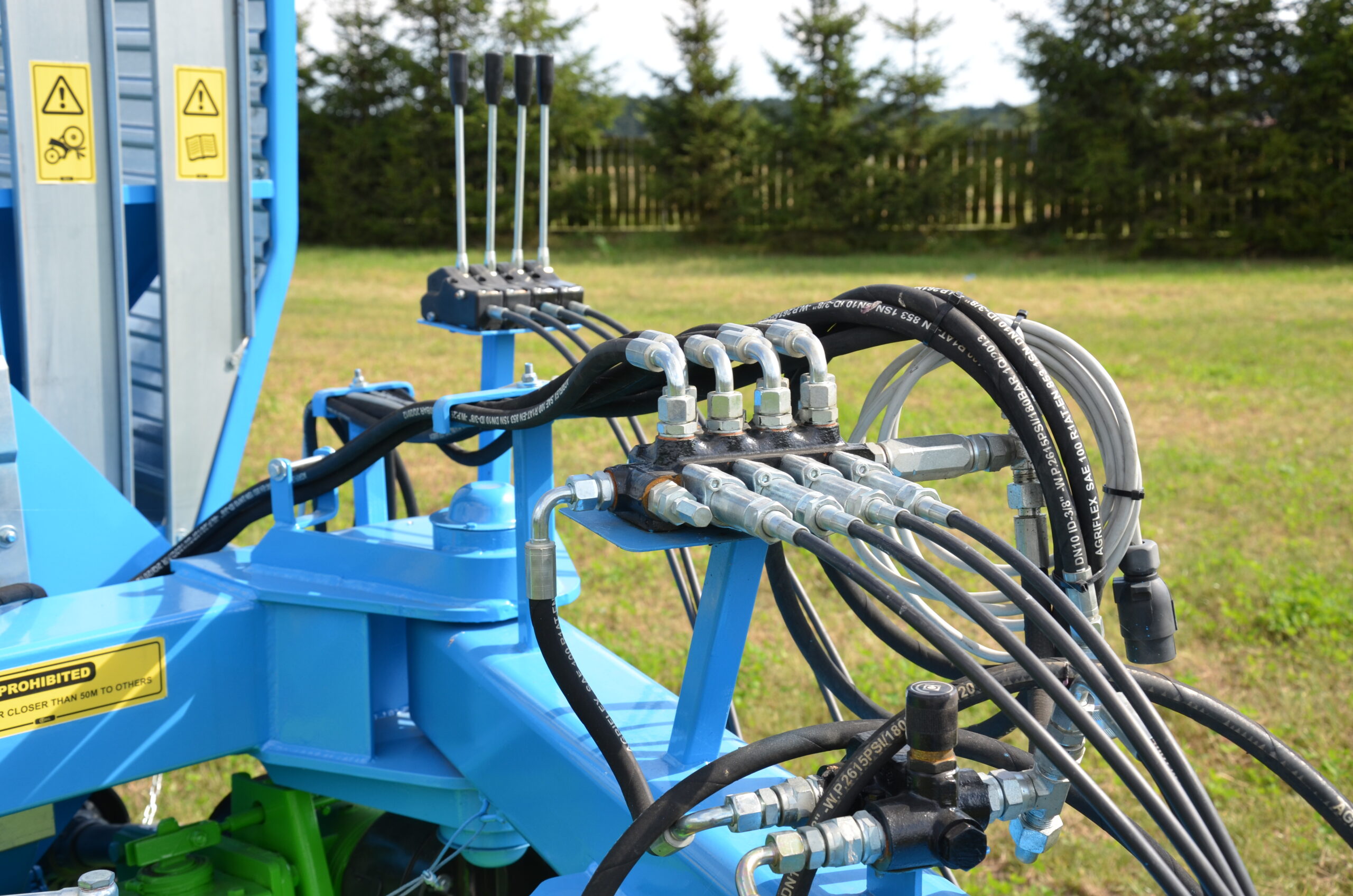 wordt aangestuurd door een driedelige hydraulische verdeler, gemonteerd op een