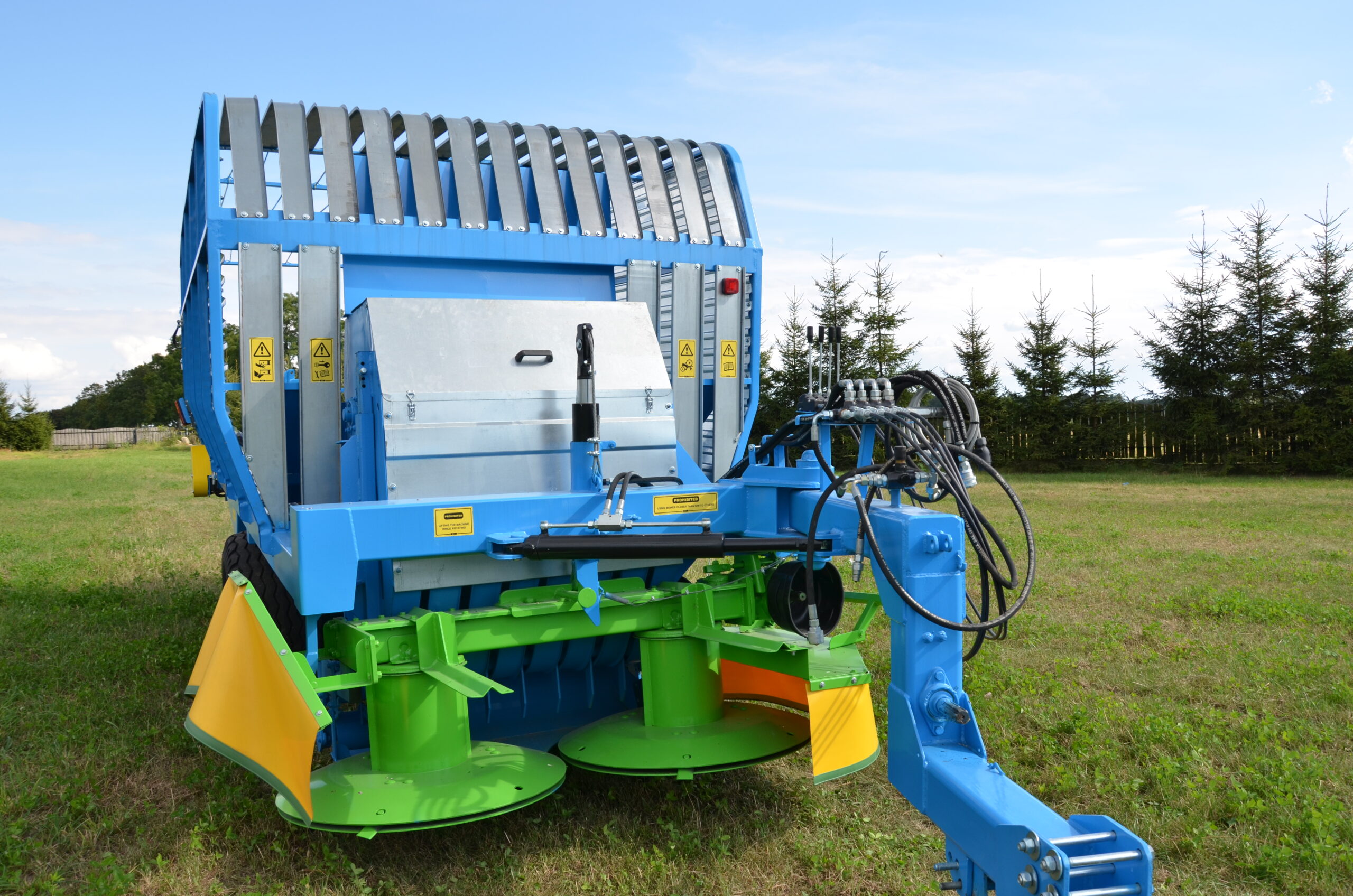 combinatie van een cirkelmaaier met een zelfophalende aanhanger. De hakselaar